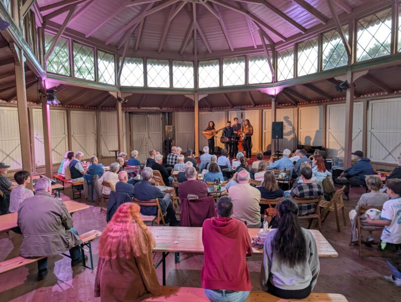 To bryllupper og en begravelse, ja, det var faktisk, hvad der lagde beslag på de lokaler i Karens Minde Kulturhus, som bluegrass-foreningen BMD plejer at benytte til deres koncerter. Vi var derfor henvist til den smukke pavillon, og det var heldigt, fordi fremmødet af medlemmer og gæster var så stort, at vi ikke havde kunnet presses ind i de sædvanlige stuelokaler.