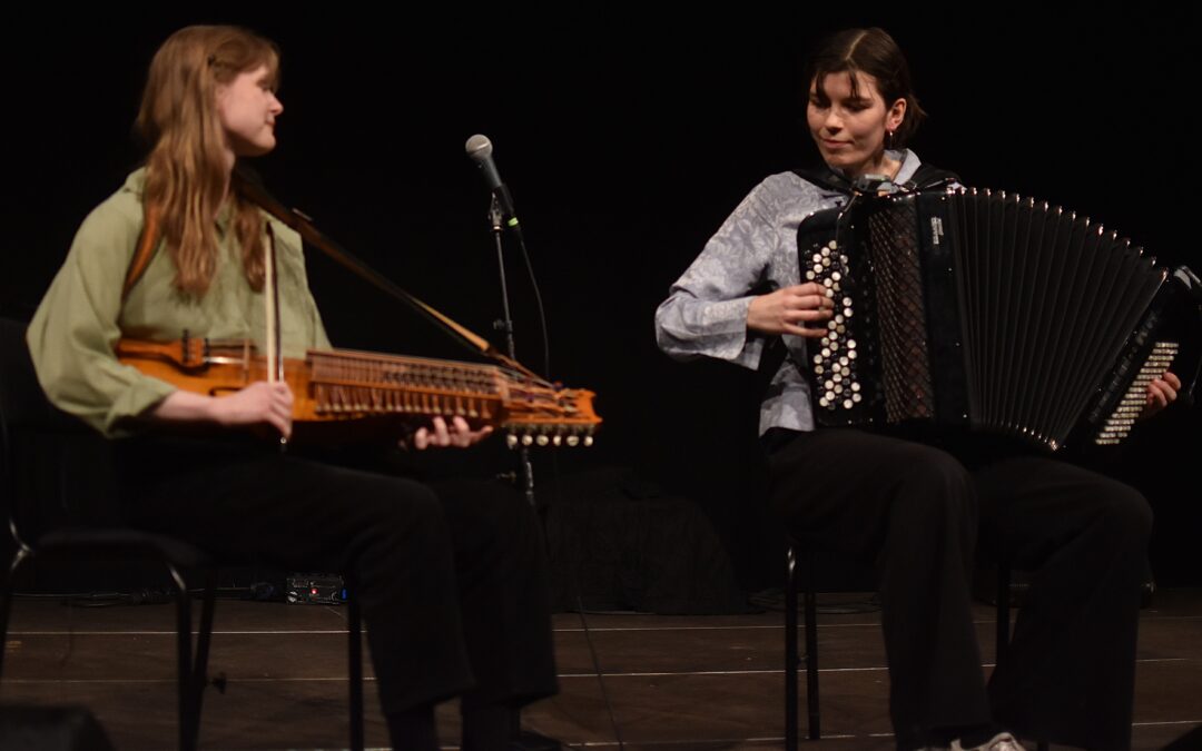 Den unge, meget talentfulde duo Flach | Østerby leverede en energisk og rytmisk præstation, der tydeligt viste deres musikalske dygtighed og kreativitet, som lover godt for fremtiden. Anna Østerby på harmonika og Henriette Flach på nyckelharpe udsendte deres første album i efteråret, og koncertens numre var naturligt nok hentet herfra. De blev præsenteret med frisk naturlighed og spilleglæde,og var en nydelse at lytte til, og alle numrene kunne egentlig være spillet ud i ét, som en slags symfoni, da det virkede som en samlende enhed. (øverste foto)